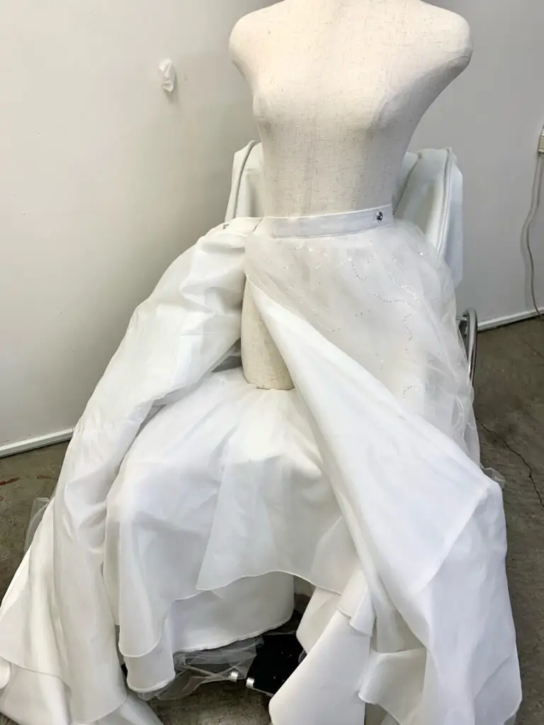 車椅子の上に巻きスカートを広げその上に座る